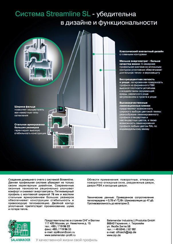 76 мм обладают улучшенными показателями по теплозащите и шумоизоляции. Приведенное сопротивление теплопередаче составляет R = 0,77 м2 °C/Вт (с армированием). Таким образом, окна Salamander делают доступными широкому сегменту рынка высокие стандарты энергосбережения и шумоизоляции.